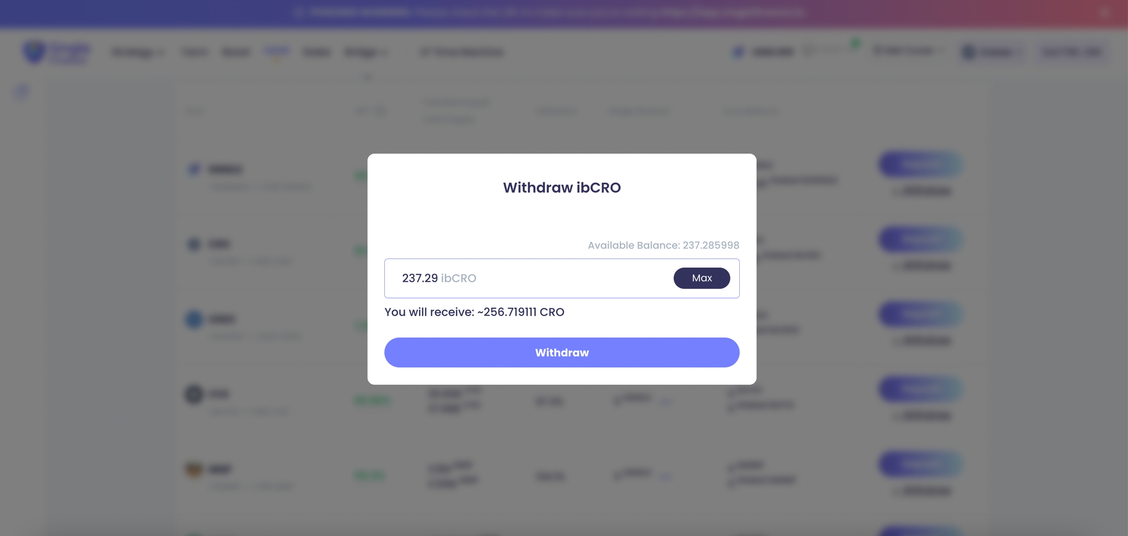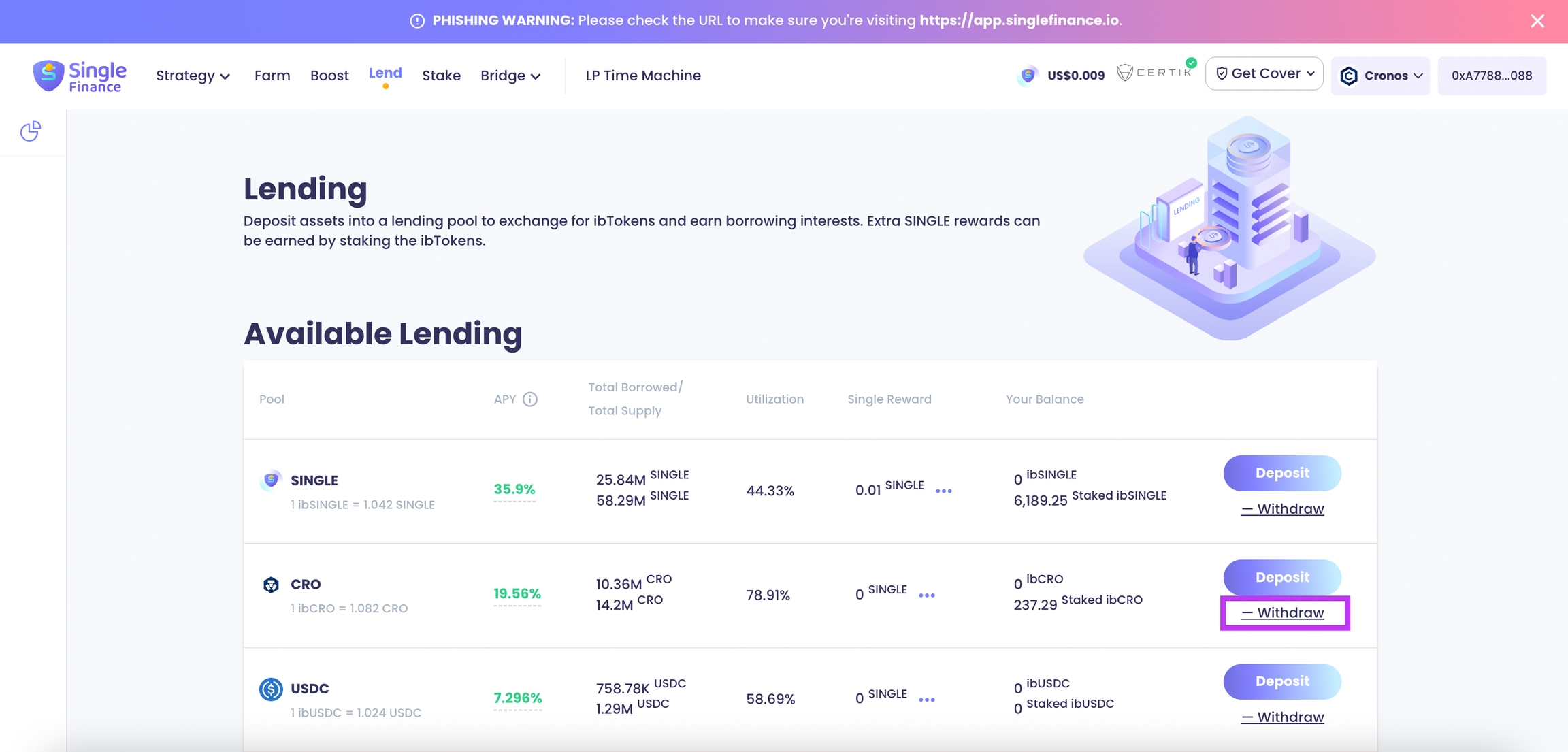 3. Input the number of staked ibToken and click "Withdraw" button. Approve the transactions in the wallet. All the deposited token (plus the interest) and extra SINGLE rewards would be claimed at once.