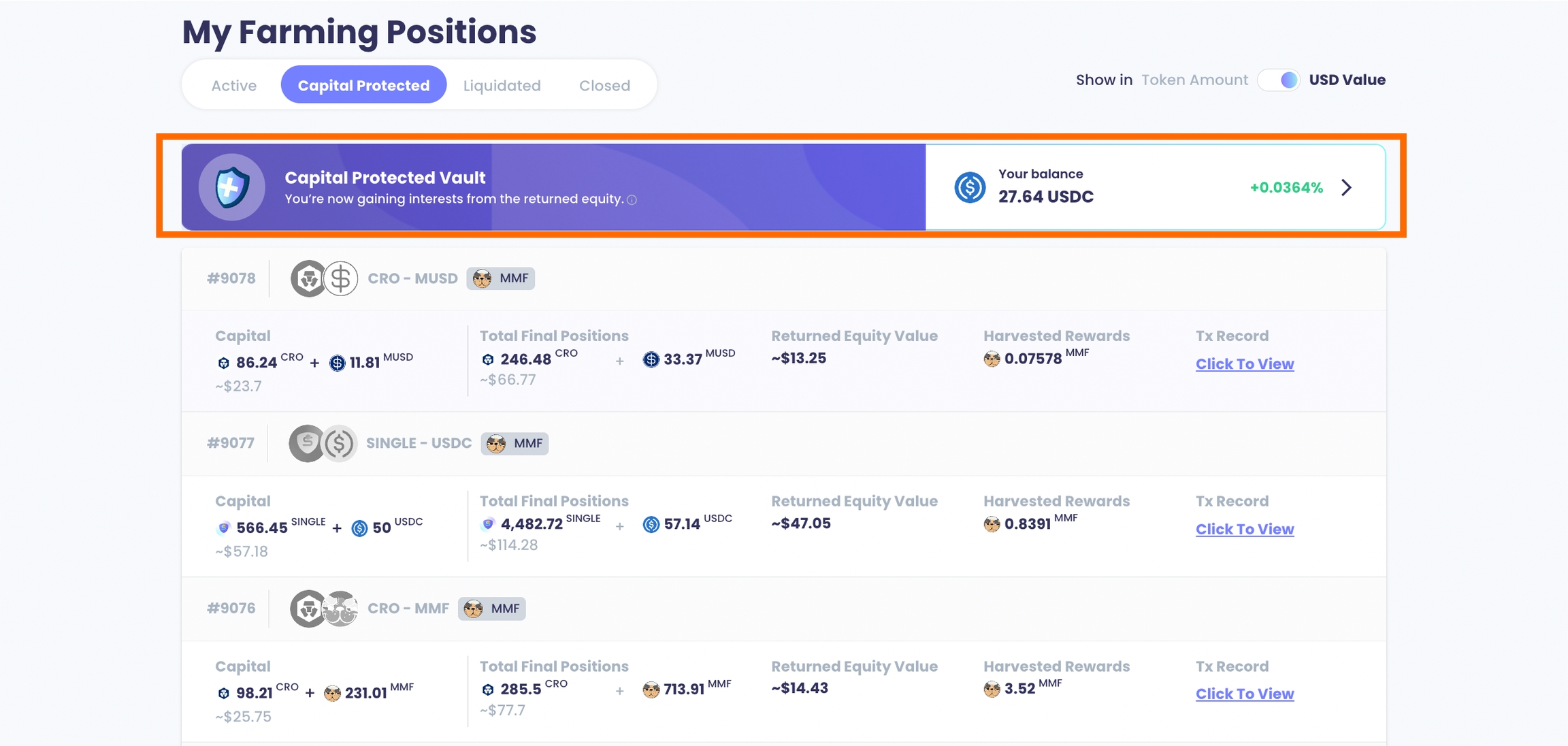Users may check the details of Capital Protection Vault in the pages of "My Positions" or "Lending".