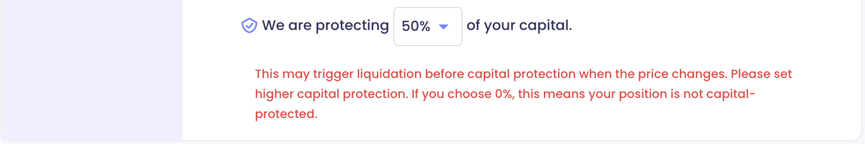 자본 보호 비율을 상대적으로 낮게 선택한 경우, 가격 변동이 발생할 때 자본 보호보다 먼저 청산이 발생할 수 있습니다. 이 경우 경고 메시지(아래 그림 참조)가 표시됩니다.