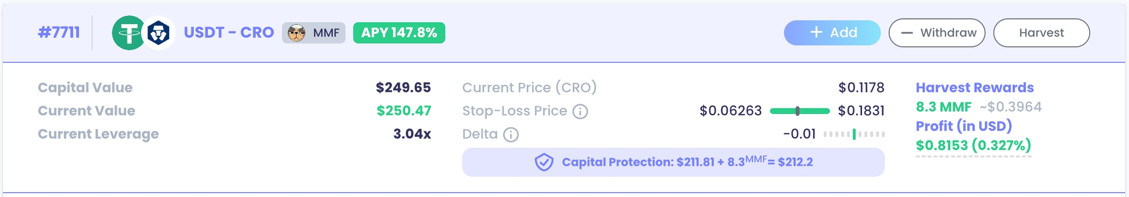 시장에서 많은 손절 메커니즘이 부채 비율을 기반으로 하지만, 우리의 자본 보호 봇은 실시간으로 포지션의 가치를 USD로 모니터링합니다. 포지션 순 가치가 미리 설정된 보호 임계값 아래로 떨어지면, 봇은 자동으로 농사 포지션을 종료하고 모든 자산을 USDC로 변환하여 잔액을 직접 지갑으로 반환합니다. 농사 포지션이 종료된 후에는, 안정되지 않은 토큰으로 자산을 반환하면 가격 변동에 영향을 받을 수 있으므로 이 점을 유의해야 합니다.