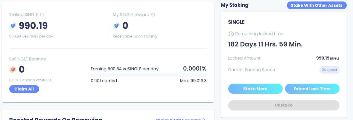 If the lock period is over, the Current Earning Speed will become 1x, you may choose to "Stake More" SINGLE/SINGLE LPs to the vault with 1x earning speed. To boost the veSINGLE earning speed back to 2x, you may choose "Extend Lock Time".