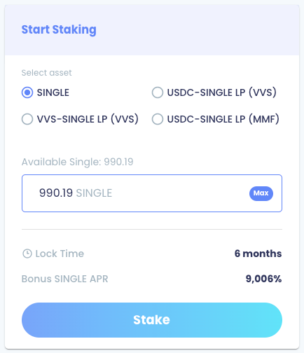Select the asset you would like to stake, either SINGLE, USDC-SINGLE LP (VVS), USDC-SINGLE LP (MMF) and/or VVS-SINGLE LP (VVS).