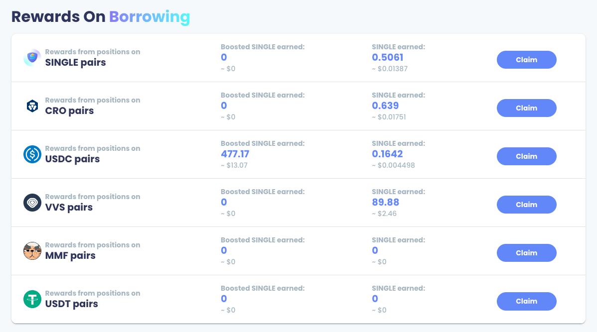 Click "Claim" to harvest the SINGLE rewards associated with borrowing each asset.