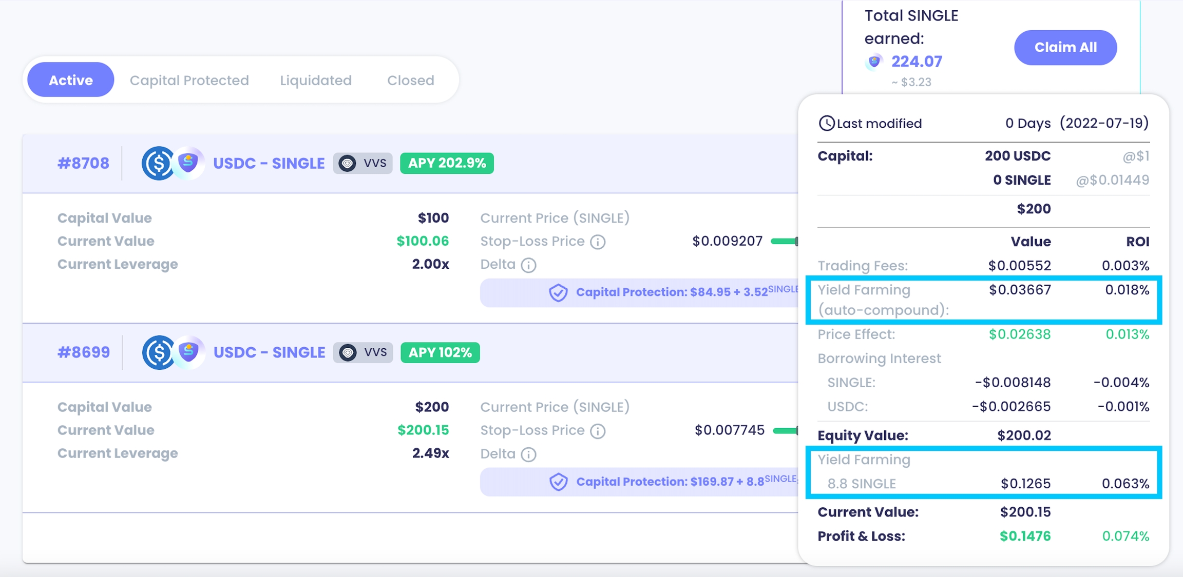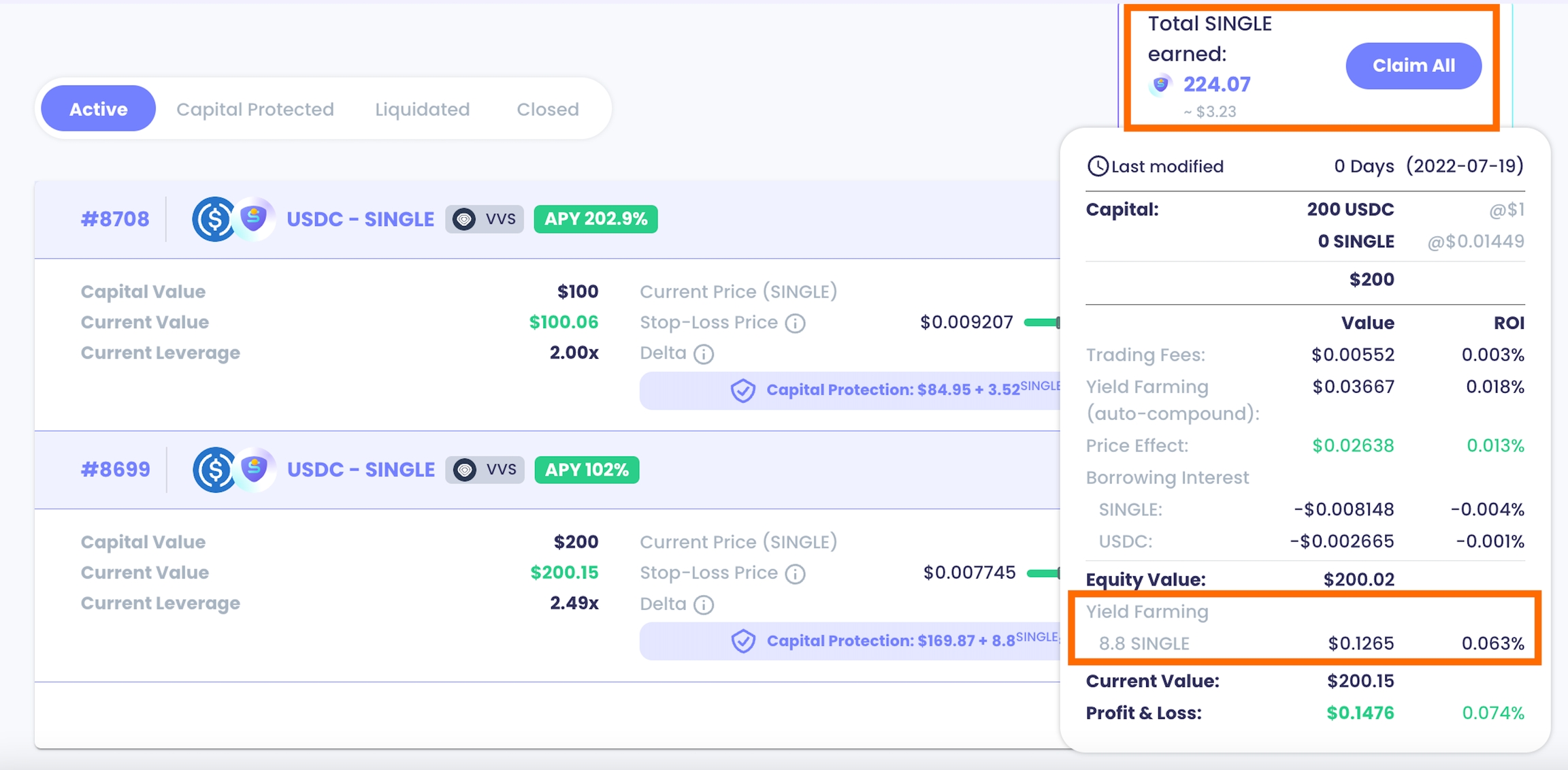 Single Finance는 전략 및 레버리지드 수익 농장에 자본 보호를 제공합니다. 포지션 당 자본 보호 수수료는 $10 (Cronos) 및 $5 (Fantom)입니다.