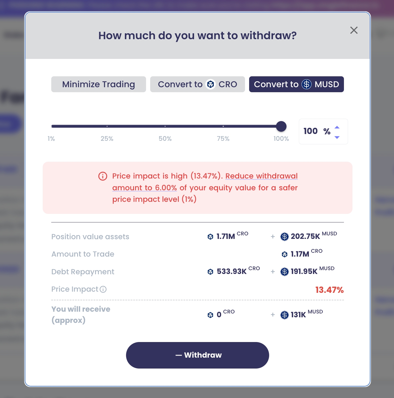 빚을 상환하고 해당 파밍 포지션을 종료하기 위해 토큰 간 스왑 중에 Price Impact가 발생할 수 있습니다. 사용자는 철회 창에서 Price Impact 추정치를 참고할 수 있습니다. 추정된 Price Impact가 높은 경우, 사용자에게는 일괄적으로 포지션을 종료하는 것이 제안됩니다. Single Finance는 또한 Price Impact 수준을 1% 이내로 제한하기 위해 최적의 철회 금액을 계산합니다. Price Impact에 대한 자세한 설명은 여기 에서 확인하실 수 있습니다.