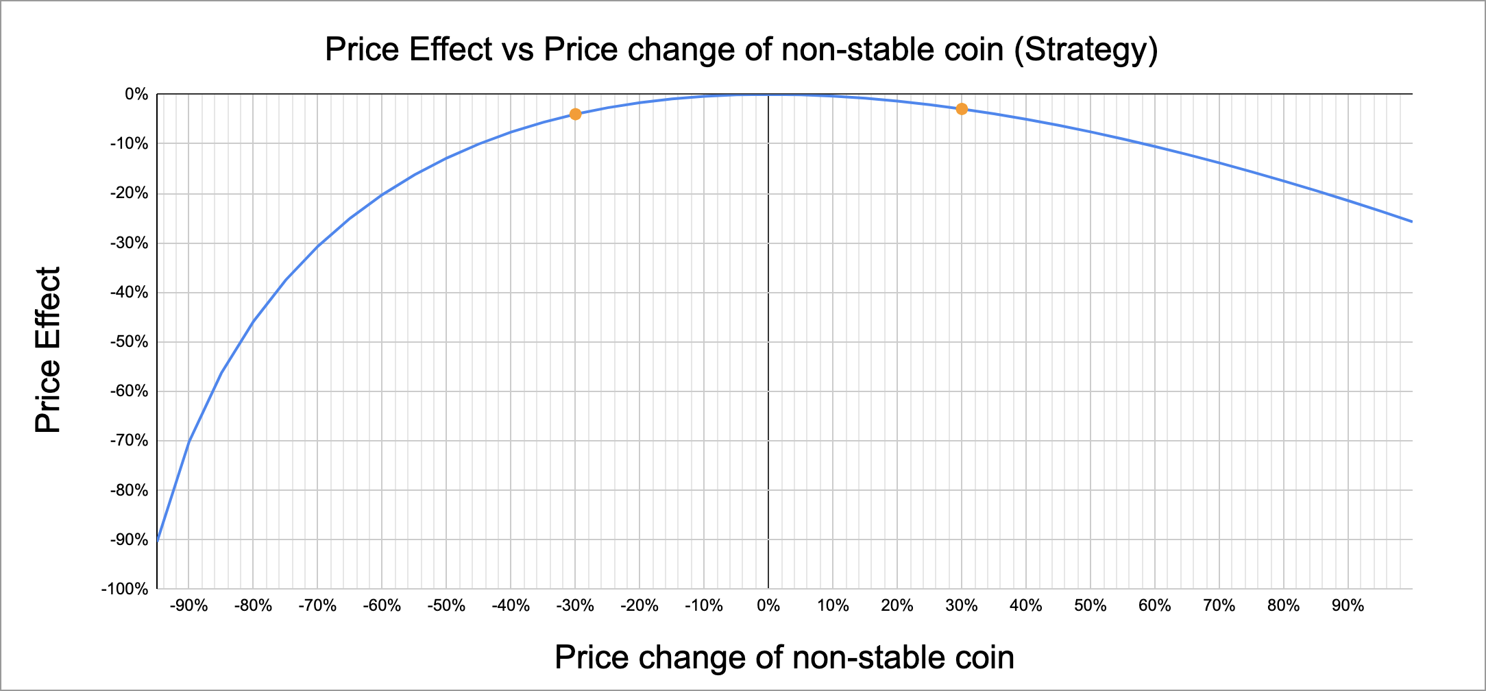 거래 수수료, 일드 파밍 보상, 대출 이자 등을 모두 제외하면 아래 그래프는 포지션의 가격 효과와 전략에 따른 논스테이블 토큰의 가격 변동 간의 상관관계를 명확하게 보여줍니다. 의사 시장 중립 전략을 채택시 논스테이블 토큰 가격이 +/- 30%(주황색 점) 변동하는 경우에도 가격 효과가 -4.0%와 -2.9%로 크게 감소하는 것을 알 수 있습니다.