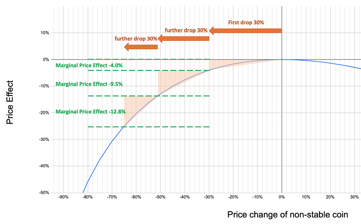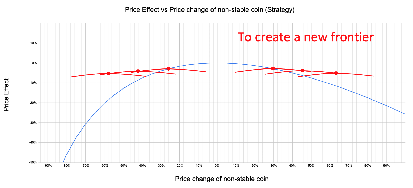 포지션 오프닝 시 초기 가격에 인접한 가격 효과 곡선이 상대적으로 평평한 것을 관찰할 수 있듯, 포지션 오프닝 시 논스테이블 토큰의 최근 가격이 초기 가격에서 멀어지면, 즉 새 프론티어를 형성하기 위해 포지션을 다시 델타 제로로 리밸런싱하여 전체 가격 효과를 줄이는 것이 효과적일 수 있을 것 입니다.