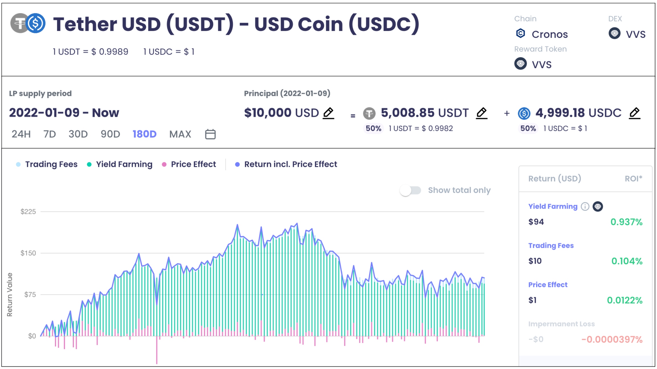 일드 파밍 포지션의 가치는 논스테이블 토큰(이 예시에서는 WCRO)의 가격과 높은 상관관계가 있습니다. 따라서 WCRO 가격이 크게 하락하는 기간 동안 가격 효과는 전체 포지션의 성과에 매우 중요한 영향을 미칩니다(-49%).