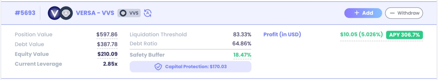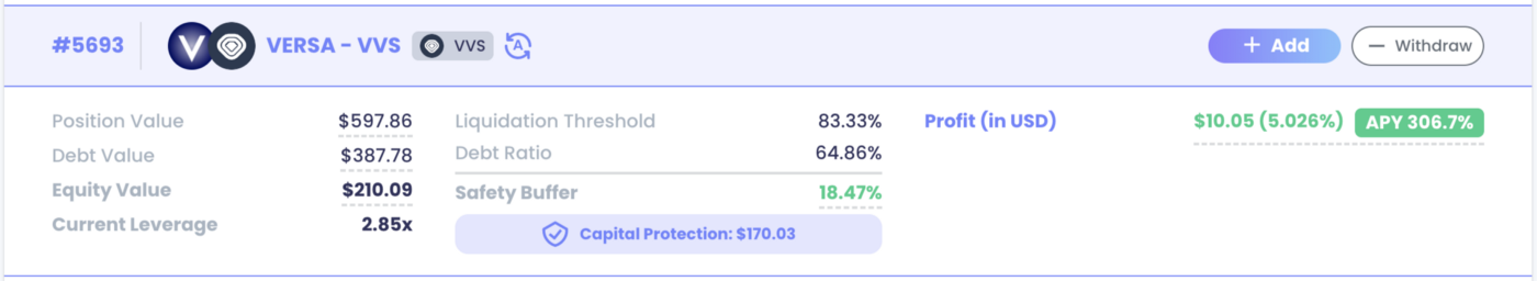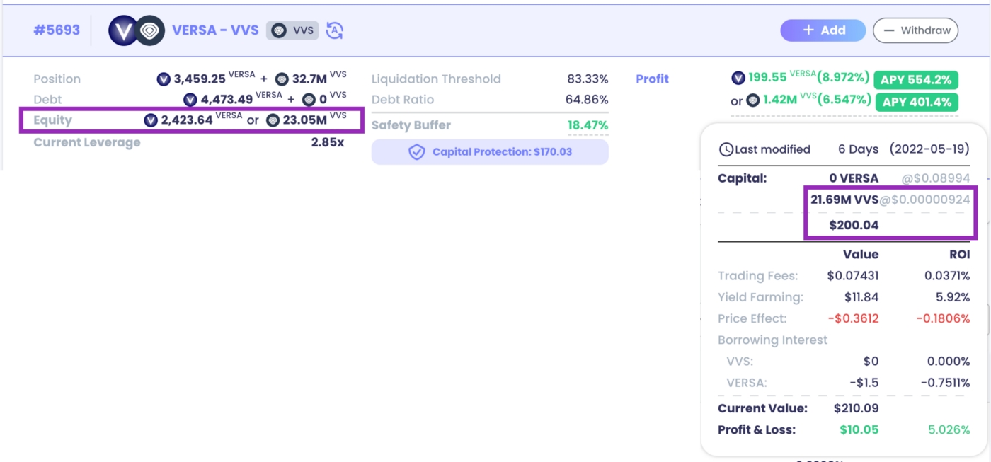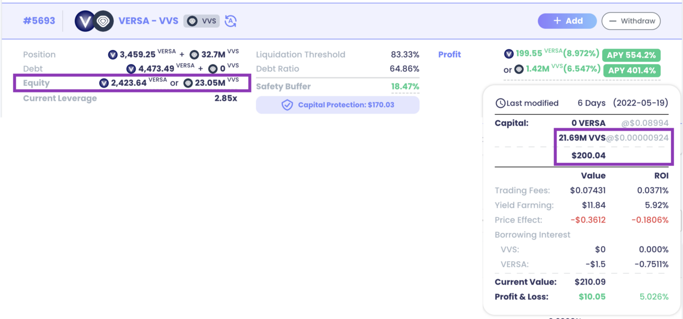 위 사용자는 21.69M VVS를 $0.00000924에 제공하였으며(가치는 $200.04), VERSA를 차입한 부채 포지션과 함께 VERSA-VVS 쌍에서 레버리지 수익 농사 포지션을 시작하였습니다.