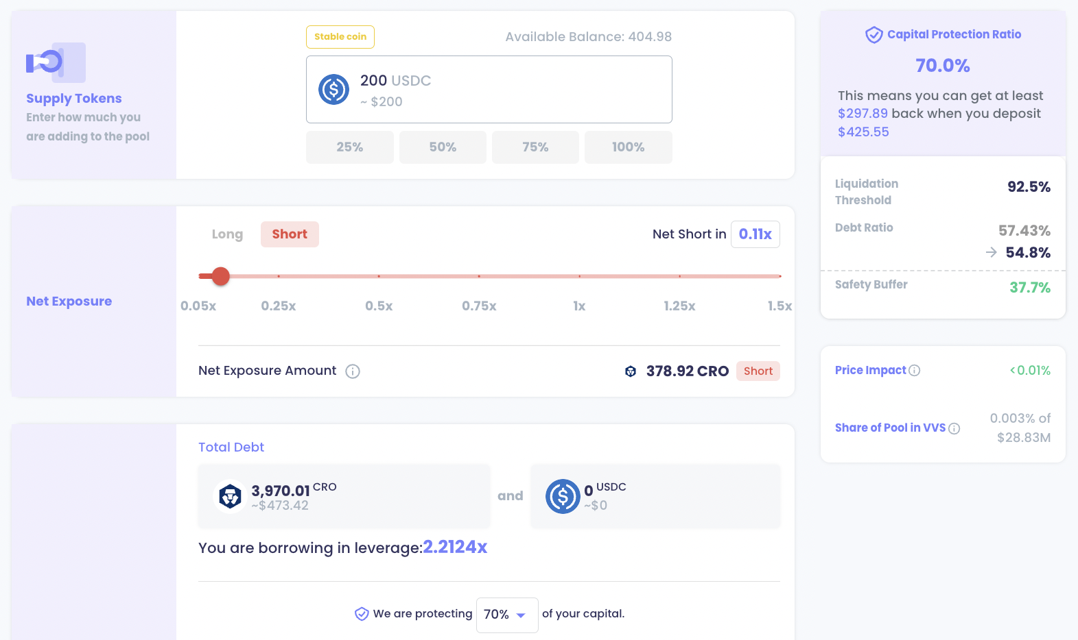 2. Enter the stablecoin amount to add to your position. The Net Exposure will be automatically adjusted to match your current leverage level. If you would like to increase leverage, use the Net Exposure slider to adjust. You may also adjust the Capital Protection Ratio in one go.