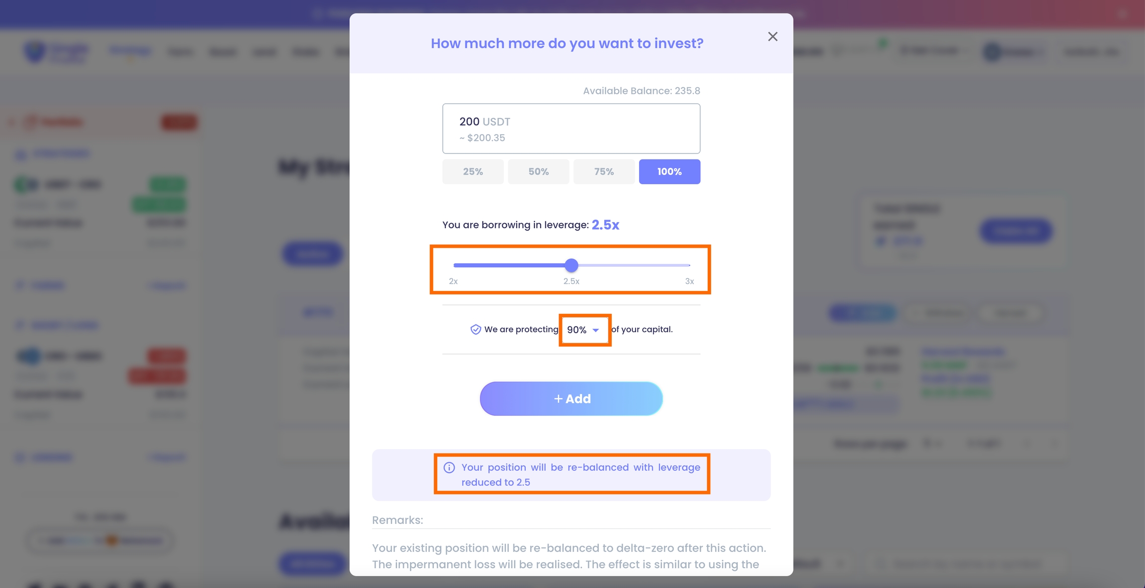 You could also update the desired leverage ratio and capital protection level of the existing position by completing this action.