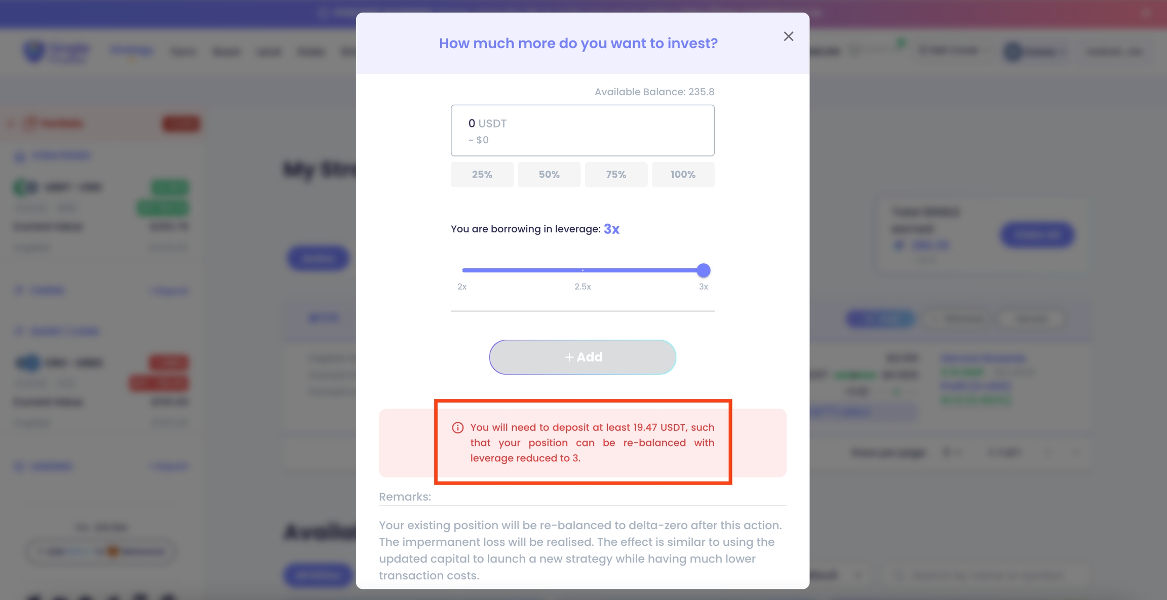 Note that if the current leverage ratio is higher than the allowable leverage ratio (3x), additional collateral must be supplied in order to complete the position adjustment. A reminding message will be shown as following.