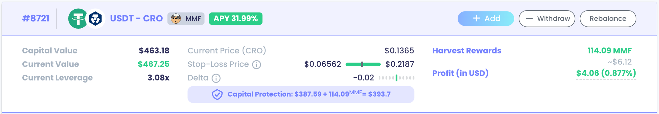 If you choose to withdraw 100%, the whole position will be closed. If the position value is close to US$200 (for Cronos) or US$100 (for Fantom) after withdrawal, the position could be easily capital-protected (i.e. position closed by our Capital Protection Bot and a $10 fee (for Cronos) or $5 fee (for Fantom) to be charged). As such, we do not allow any withdrawals that would result in a net value below US$200 (for Cronos) or US$100 (for Fantom).