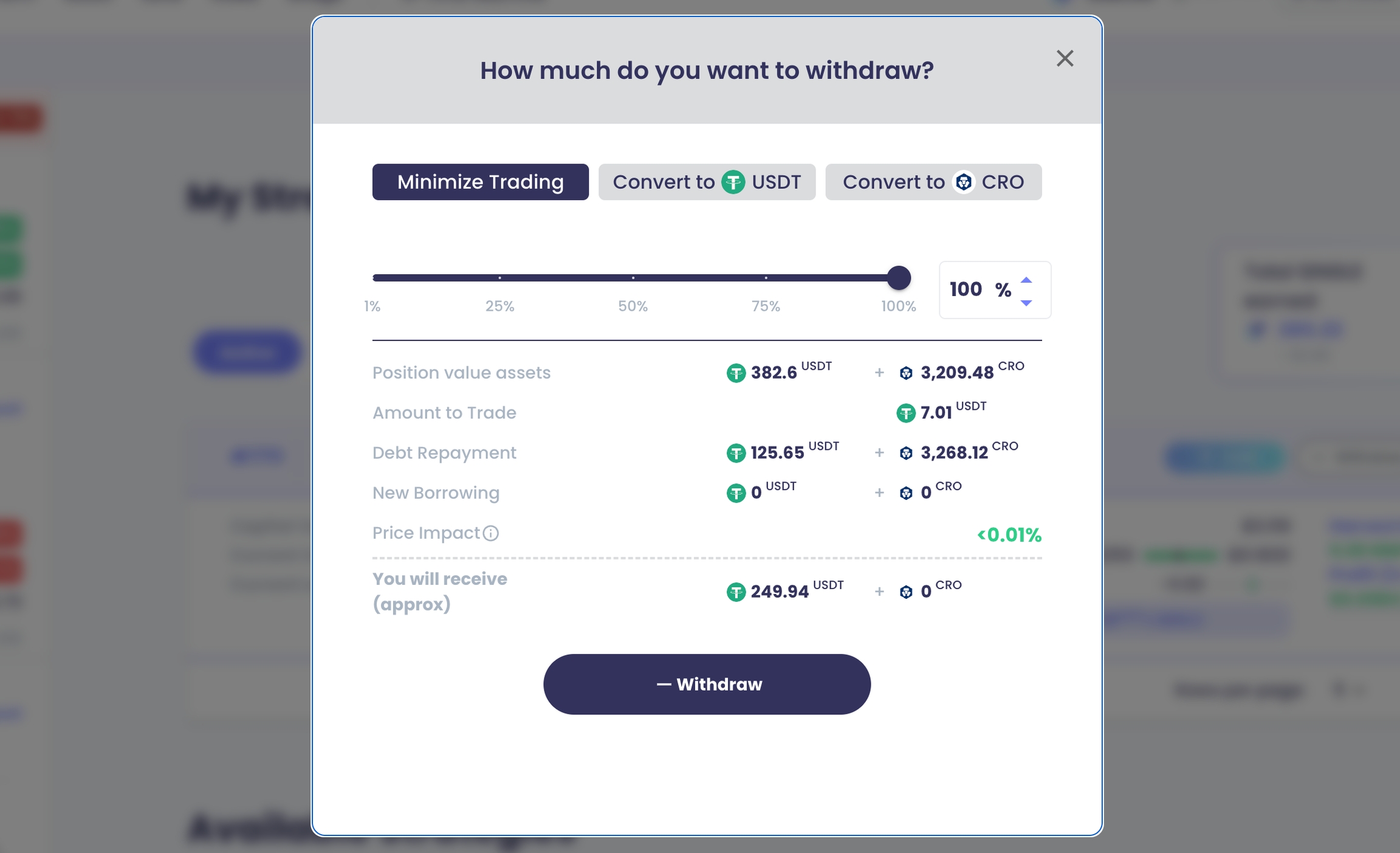 3. Choose the percentage of the position you want to withdraw and the mode of withdrawal you prefer.