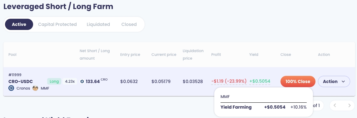 6. After the farm is opened, the status of the farm is shown in the portfolio bar under the "SHORT/LONG" section. To view more details, click on it to be brought to "My Positions".