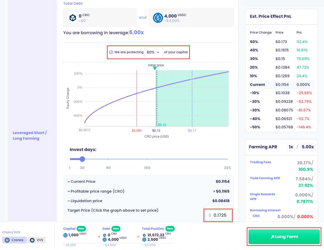 5. Set the desired capital protection level and target price, then Single-Click the "Long Farm" or "Short Farm" button on the lower right hand corner. Approve the transaction in your wallet.