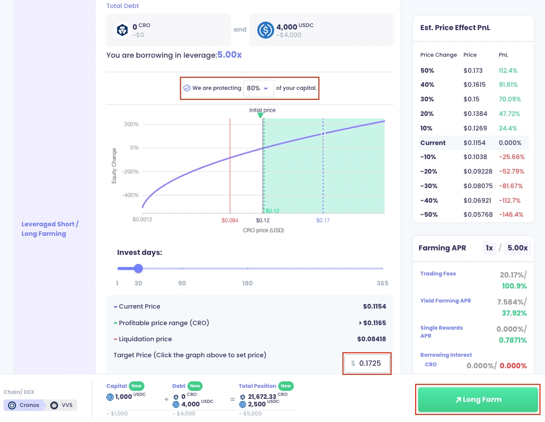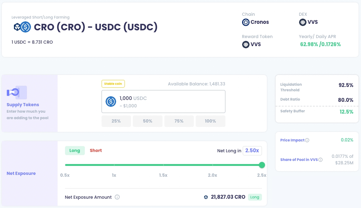 4. Input the principal amount in terms of stable coins (USDC), adjust the net exposure to CRO (Long/Short)