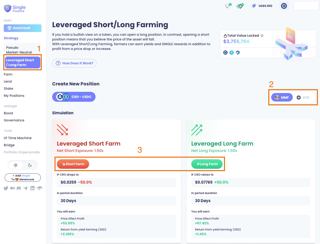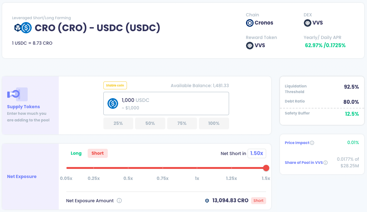The maximum Net Short position on CRO for a Leveraged Short Farm is 1.5x short under 5x leveraged yield farming, i.e. you initially hold a net short position on CRO that is equal to 1.5 times your principal.